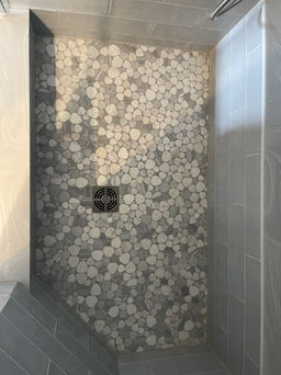 This project began with adding custom niches and waterproofing both showers. They both feature beautiful glass tiles that fit perfectly with this lakefront home.